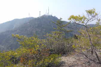 標高差20m程登り返すと、小さなピークになり、振返ると、小富士山の山頂が見える。行く手を見ると、鉄塔が建ち並ぶ仁寿山の山頂が見える。 |