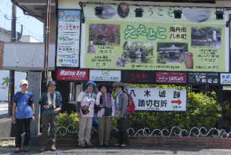 八木駅で下車、人が見当たらず近い田舎に来たものだ。支度をして出発、駅前の大きな観光案内板の前で記念写真。 |