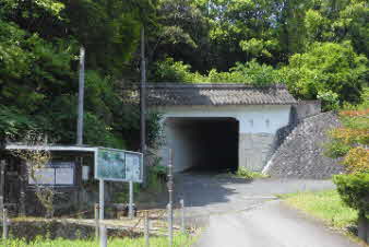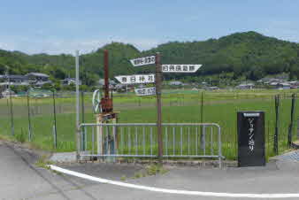 顕彰碑の反対側に、春日神社があり。さらに進むと、京都縦貫自動車道の下をくぐる。トンネルになっていて入口はお城の門をイメージしている。 |