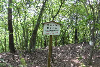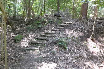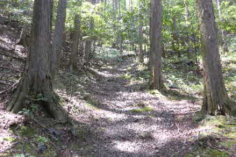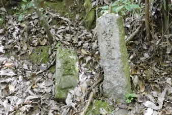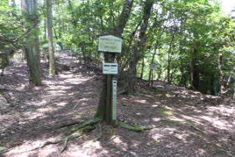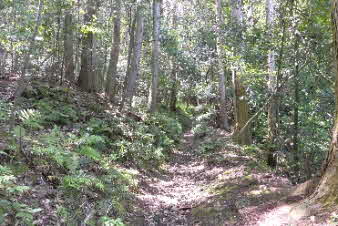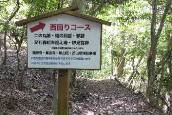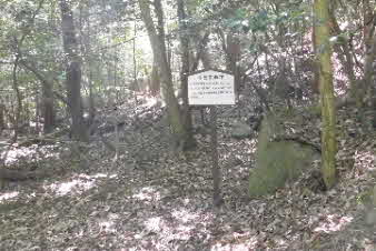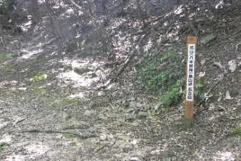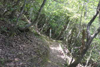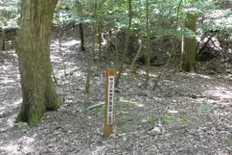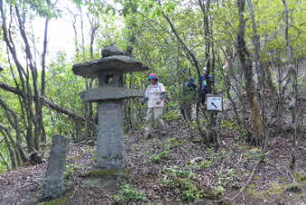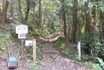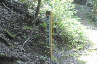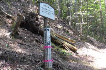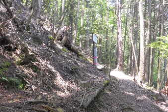 | 緩やかな道と合流して少し下ると、四合目を通過する。そしてさらに5分ほど下ると、妙見宮常夜塔に下ってくる。ここから右上に登っていくと、妙見宮跡で、足利義明将軍をお迎えした場所だそうだ。 |