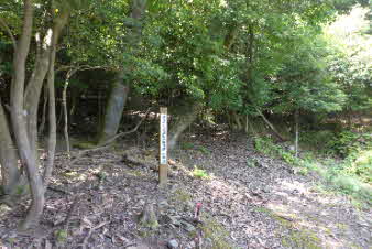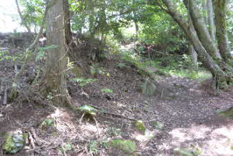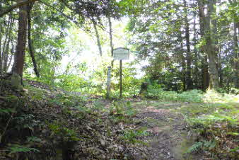 左上に少し登ったところに対面曲輪所跡があったようだ。その場へは反対側からの道もあった。それによると、対面所は門番の詰め所で、堀切と土塁があって、曲輪の周辺には大手門があったらしい。 |
