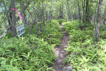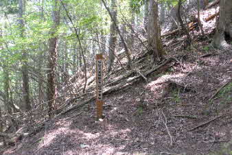 | さらに10分ほど下ると、五合目になる。ここから右下へは急な下り、左は尾根の緩やかな下りと記されていた。急な方を選んで下る。ロープも下がっているので時々利用して下る。 |