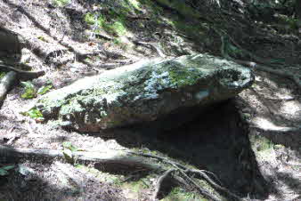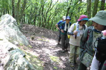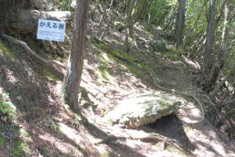 | 脇道から戻り少し登ると、道の途中に小さな岩がある。かえる岩と言われていて、目と口がかえるそっくりだ。説明によると、当時山道にある岩を利用して敵の侵入を阻止する板塀があったそうだ。その一つの岩がかえるに似ていることからかえる岩と言われているそうだ。 |