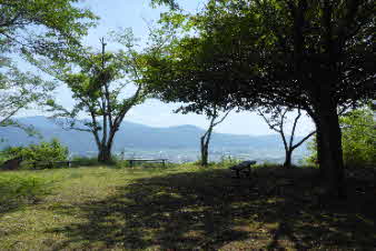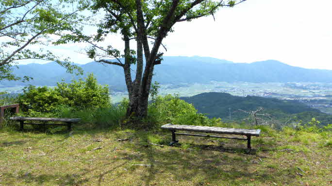 八木城址本丸跡に到着、広々した本丸跡で、ここからの展望も素晴らしい。亀岡から千代川、八木の田園風景、中程を大堤川が流れている。その先には愛宕山、牛松山、三郎ヶ岳などの山並みも見える。