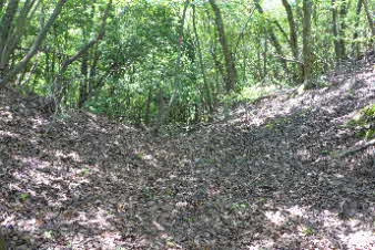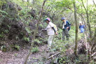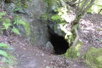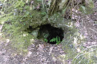 | 西回りコースを下りはじめて3分ほどで、「姫の洞窟」があった。明智光秀の丹波攻めで内藤一族の娘がこの洞窟から逃げたそうで本丸へと続いているとか。そのせいか2分ほど下ると、同じような姫の洞窟があった。 |