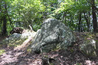 | 洞窟の辺りに堀切の跡があり、少し登ると、八合目そして二ノ丸跡・西国砦跡に着く。大きな岩が中央にあり、ここに櫓があったのだろうか。 |