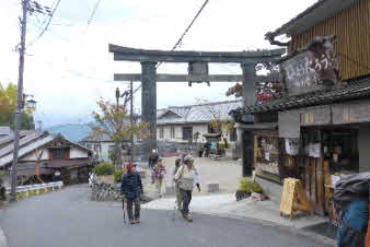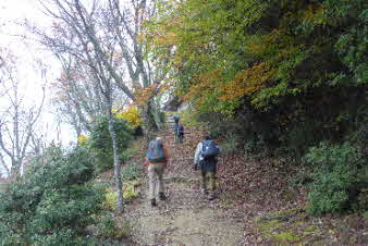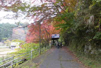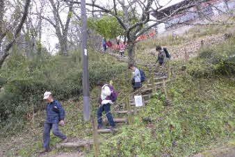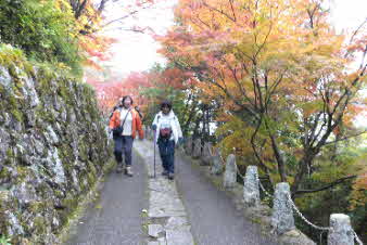 吉野駅に到着、支度をして9時30分歩き始める。ロープウエイ乗場の横から山へと登っていく。通りの広い道まで、つづら折りの道がついているが、ほぼクロスして階段道があり、そこを登っていく。眼下に吉野山の紅葉が広がってくる。 |