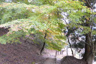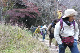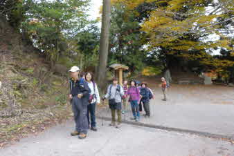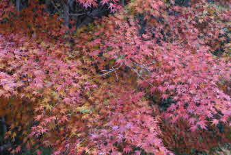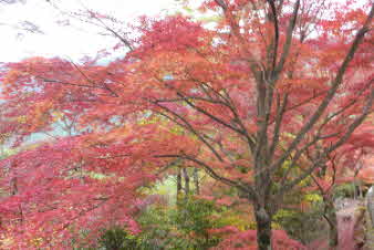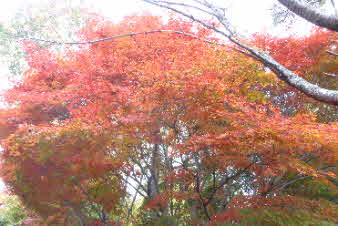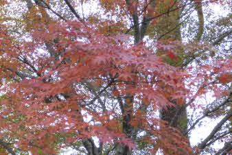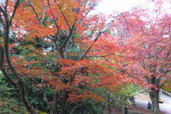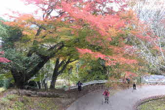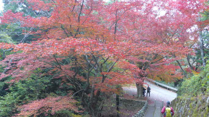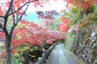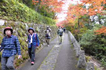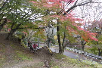 | 最後に近い紅葉の見どころは、この展望台から下る、紅葉のトンネルだ。古い石垣と真っ赤に燃える紅葉がとても素晴らしい。残念ながら今日の紅葉の見納めだ。 |