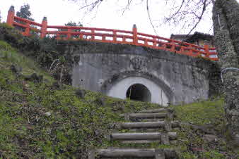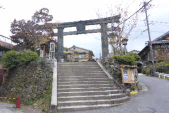 | さらに進むと、石段の上に大きな鳥居が見えてくる。銅の鳥居(かねのとりい)で、金峯山寺の銅で作られた鳥居だ。大峯山上までに、修行、等覚、妙覚の3っの門があり、この鳥居は第一門で「発心門」と呼ばれるそうだ。東大寺の大仏さんを造ったときに、余った銅で造った鳥居とか。 |