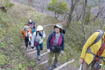 | 吉野水分神社の下を通って急坂を登り詰めていく。そこから15分ほど登ると、高城山のトイレに着き、用を済ませて、急斜面を登っていく。 |
