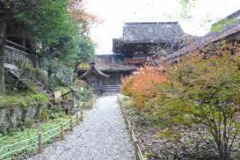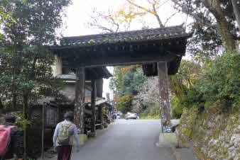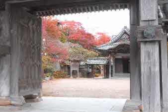 | 蔵王堂をあとに先へと進む、吉水神社は帰路寄ることにして、次の勝手神社へと進む。お参りして先へと進む。竹林院の門の奥に紅葉が見えてきた。門から望む紅葉は素晴らしい。 |