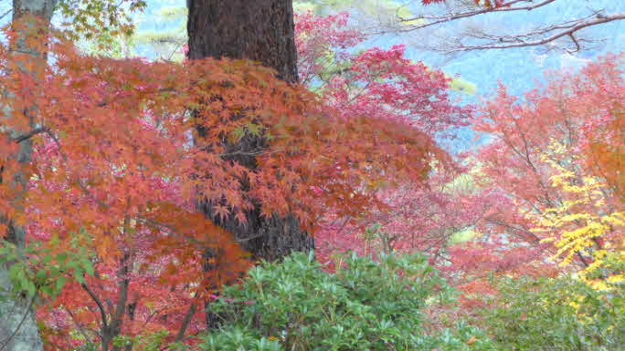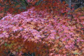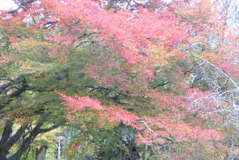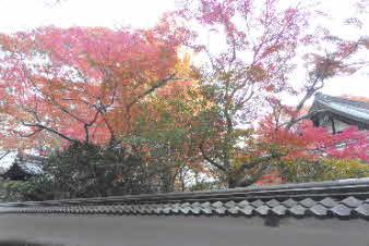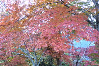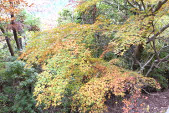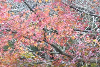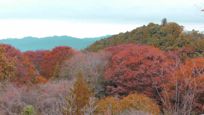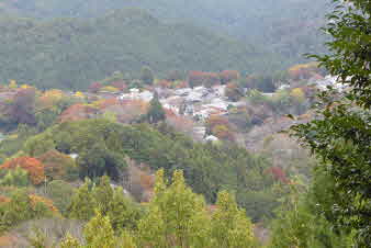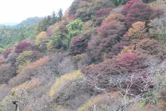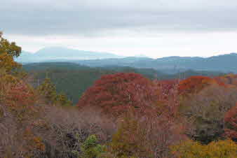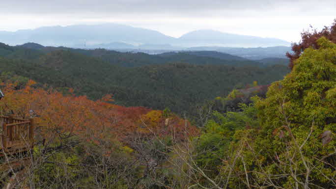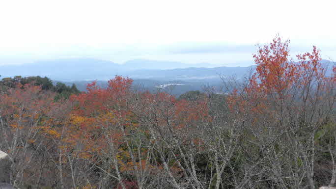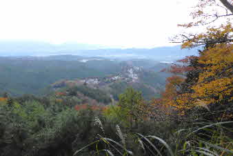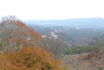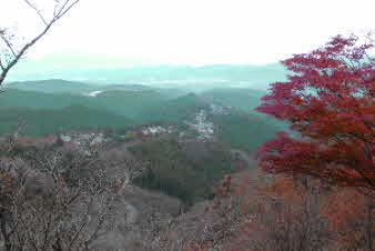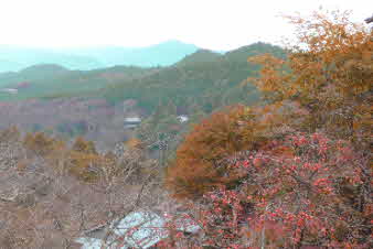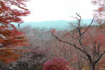 | 吉野山の紅葉も次第に美しくなってきた。遠くに金剛山、葛城山、二上山がシルエットで美しい。残念だが天気がもう少し良ければ、紅葉が映えるのだが残念だ。 |