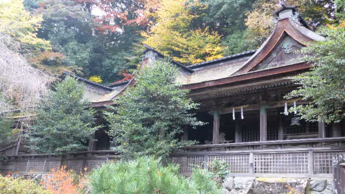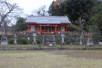 | 高城山をあとに、高城山の裾を巻いて下山し始める。往路行けなかった吉野水分神社にお参りした。社殿がコの字に配されていて、とても美しい神社だ。水の分配を司る天水水分大神(あめのみくまりのおおかみ)が主祭神だ。 |