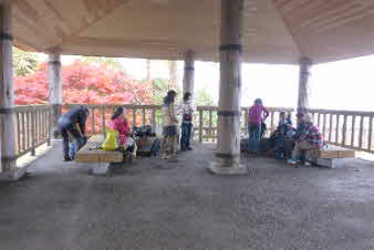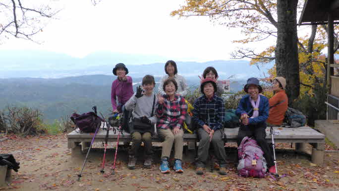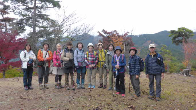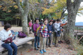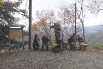 展望台で昼食休憩をとってゆっくりと寛ぎ紅葉を楽しむ。これから本番の金峯神社、西行庵の紅葉を見に行くはずだったが、体力に限界が来てしまって、往路を下山することになった。 |