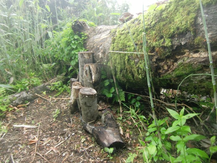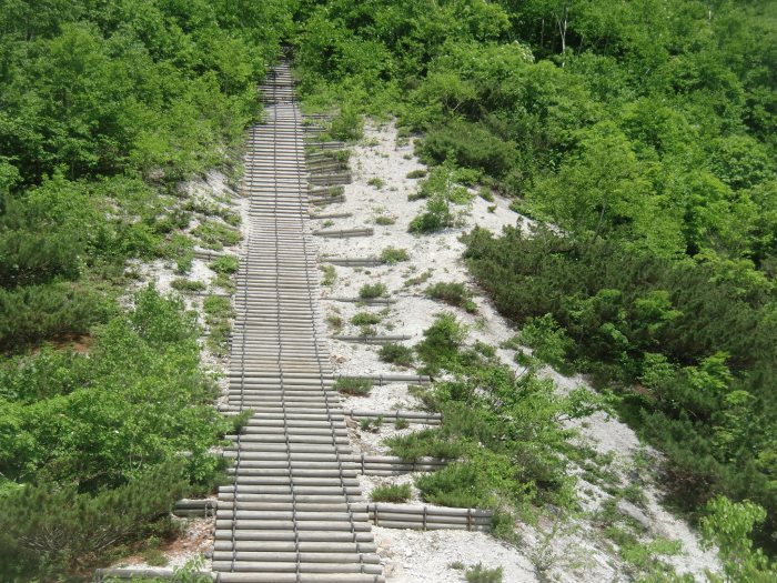ものすごい倒木(直径1m程)の前後を小木で階段が