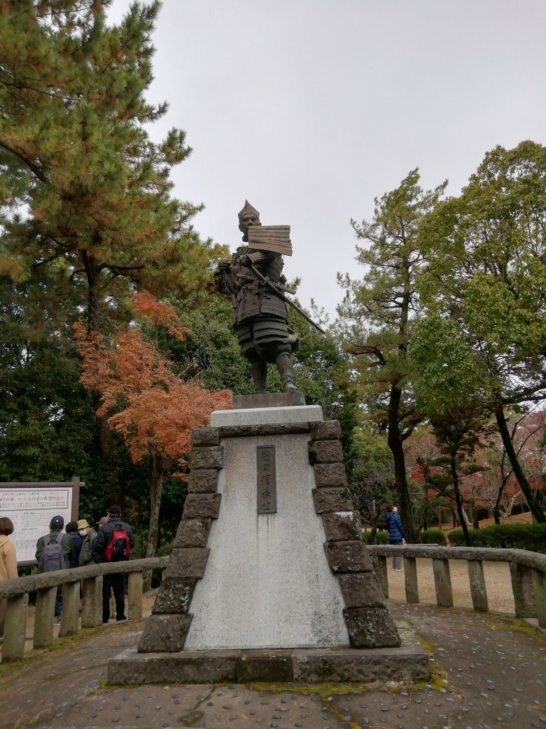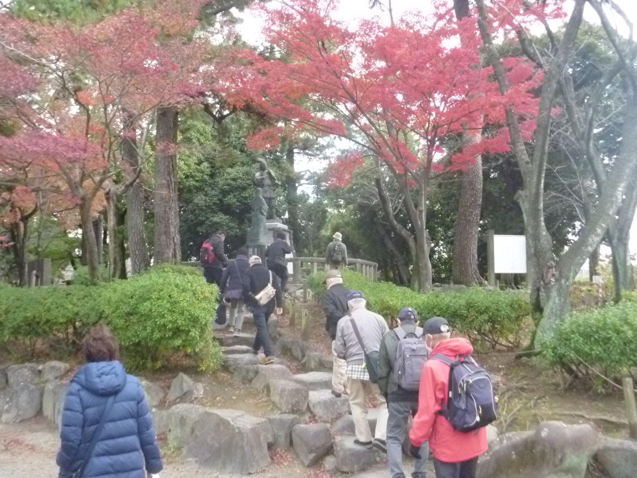 公園では 織田信長が桶狭間の戦いに 出陣した時の雄姿像と・濃姫像。 信長と清洲城の年表で少しお勉強を五条川(春は桜)沿いに 東海道新幹線をくぐり清洲城に 例年は散っている、もみじも色鮮やかに見頃でした。
