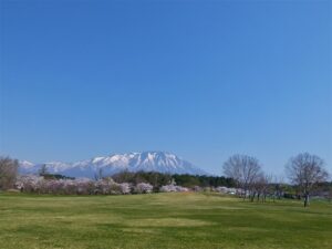 残雪の秀峰岩手山を背景に約100年前小岩井農場の大地に植えられ根を張る