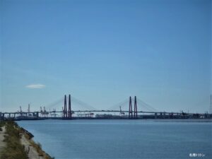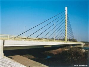 ②斜 張 橋:塔を建て塔から斜めに張った複数のケ-ブルで桁やトラスを吊る構造