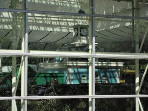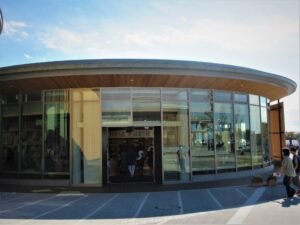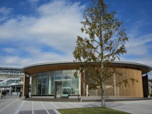 新設され、案内所やカフェ、コンビニ、ショップなど円柱形の建物がある。