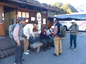 基点となる落合宿旧役所跡広場までバス移動、落合バス停で降車基点場所に