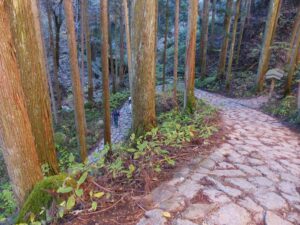 1,5km先の”落合の石畳”に向かうことに石畳は急勾配の上り坂、苔むす