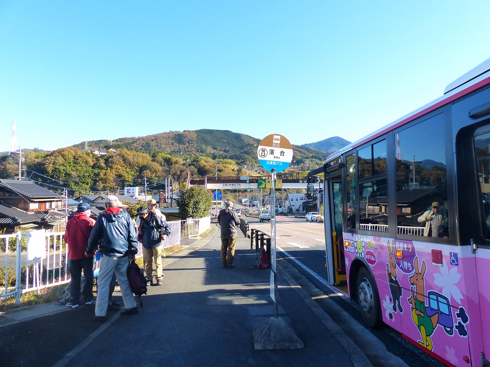 基点となる落合宿旧役所跡広場までバス移動、落合バス停で降車基点場所に