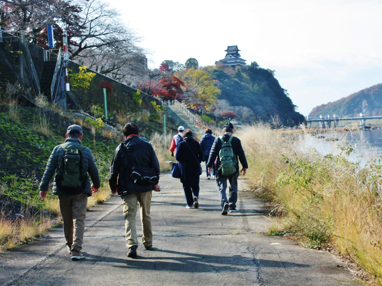 続いては、国宝犬山城を目指し、途中の鵜飼乗船場を越えてから木曽川遊歩道に入り、木曽川の横を眼前の犬山城を眺めながら歩きました。