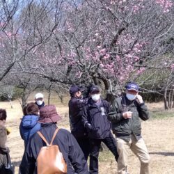 見晴らしの良い場所でワイワイ・ガヤガヤと楽しい昼食時間を済まし 午後の歩きへ梅林到着!しかしながら楽しみの一つ ”梅”は 殆ど散っており残念・・・・・!
