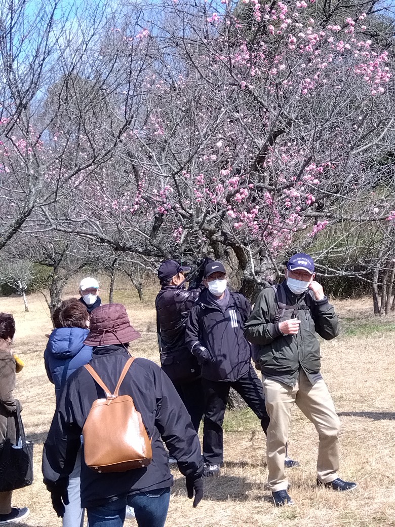見晴らしの良い場所でワイワイ・ガヤガヤと楽しい昼食時間を済まし 午後の歩きへ梅林到着!しかしながら楽しみの一つ ”梅”は 殆ど散っており残念・・・・・!