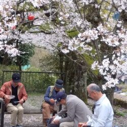 美濃太田駅に18人が集結、列車に揺られ、車窓からの眺め(山々の桜)郡上市内、桜の名所、乙川女堤、愛宕公園(飛騨・美濃さくら33選)樹齢400年の桜を愛で、公園内で花見・小宴会でわいわいと・・記念撮影、その他映画サトラレのロケ地、吉田川堤等々巡り さくらを堪能、全員無事8キロを完歩帰りの車内では途中の駅から、高校生の下校集団が乗り合わせ、うち新一年生が 我々の前にワンカップ片手を見られながらも、悪びれもなく会話、会話にうなずく新高校生の一年生が降り際に、長生きして下さいと励まされ、恐縮と笑い。楽しい一日でした。
