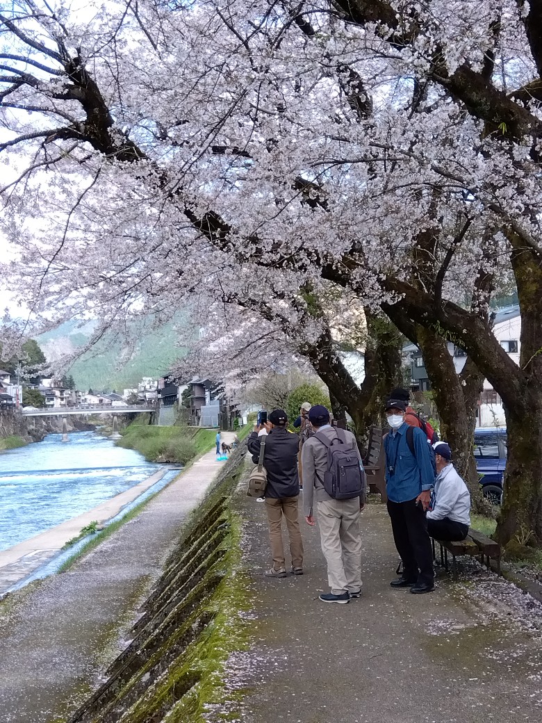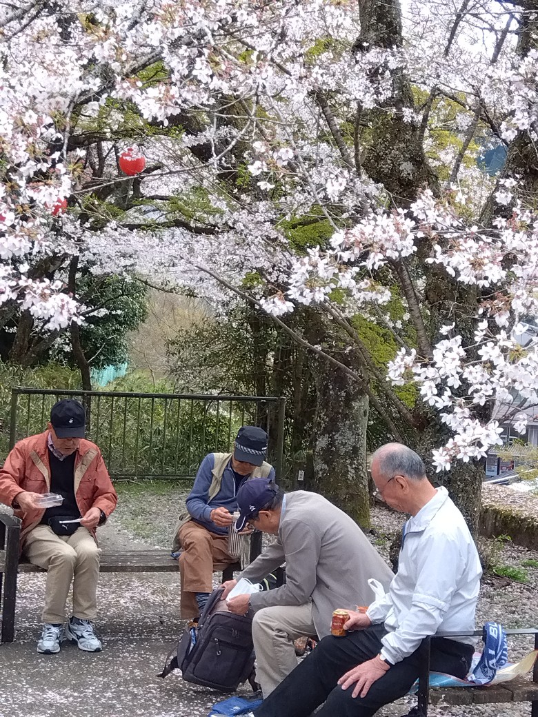 美濃太田駅に18人が集結、列車に揺られ、車窓からの眺め(山々の桜)郡上市内、桜の名所、乙川女堤、愛宕公園(飛騨・美濃さくら33選)樹齢400年の桜を愛で、公園内で花見・小宴会でわいわいと・・記念撮影、その他映画サトラレのロケ地、吉田川堤等々巡り さくらを堪能、全員無事8キロを完歩帰りの車内では途中の駅から、高校生の下校集団が乗り合わせ、うち新一年生が 我々の前にワンカップ片手を見られながらも、悪びれもなく会話、会話にうなずく新高校生の一年生が降り際に、長生きして下さいと励まされ、恐縮と笑い。楽しい一日でした。