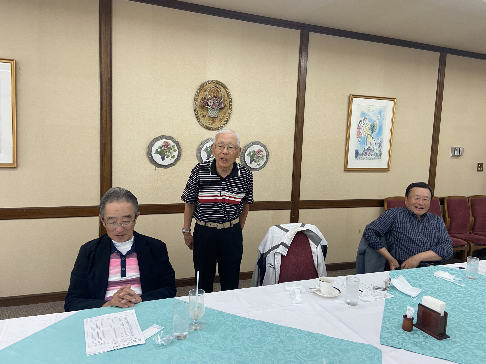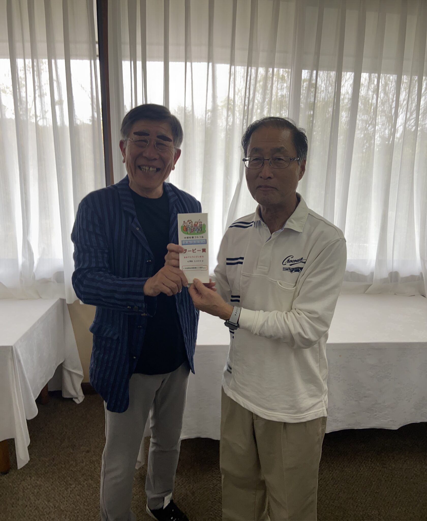 コメント:曇りですが風もなくゴルフ日和  20名参加。今回は、80台最高齢の松田大先輩が、素晴らしい優勝でした  ドライバーからアイアン迄絶好調 ニアピンも2つ  80台ゴルフは私たちの憧れです