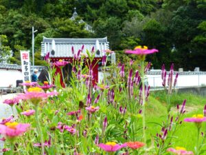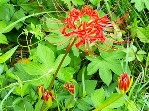 巡拝の道すがら今が旬、ヒガンバナやヒャクニチソウそしてサルスベリの赤い花にひと