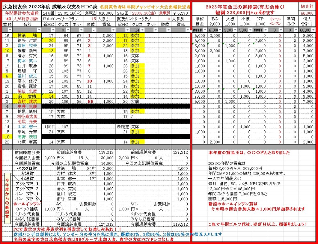 2023.05.16 広島松友会レポート, 広島西部 広島松友会2023 広島松友会 令和5年5月レポート 新規入会扱いの山本憲一さんに初参加いただきました。 9月から休会していた高野茂樹さんがハンデ36で参加いただきます。 広島松友会の開催250回記念の豪華宿泊懇親会を 11/14例会の鷹の巣CCでプレイ後に、最寄りの湯来ロッジにて開催いたします。 湯来ロッジは予約済みです。 5月例会の結果は添付の通りです。 今回の成績表(優勝は横溝さん)と写真 投稿者: wchugokusumii 広島松友会レポート, 広島西部