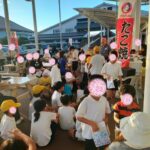 当日は小学校の授業が終わる時間に唐弓さんの奥様が校庭まで迎えに行き、学校関係者と一緒に集団で会場まで徒歩数分。小学校から直接道の駅に来られる児童や、一度帰宅して保護者と一緒に来られる児童がおられ、約80人のこどもや保護者とボランテアの方が集まり、町内の民生委員さんのギターや地元で活躍されているバイオリニスト・主婦の方のリコーダーなどの伴奏で歌を歌ったり、すぐ隣の公園で遊んだり・宿題をしたり・おかわり自由のたこ焼きを食べたりで、15時過ぎから18時まで楽しんでいました。