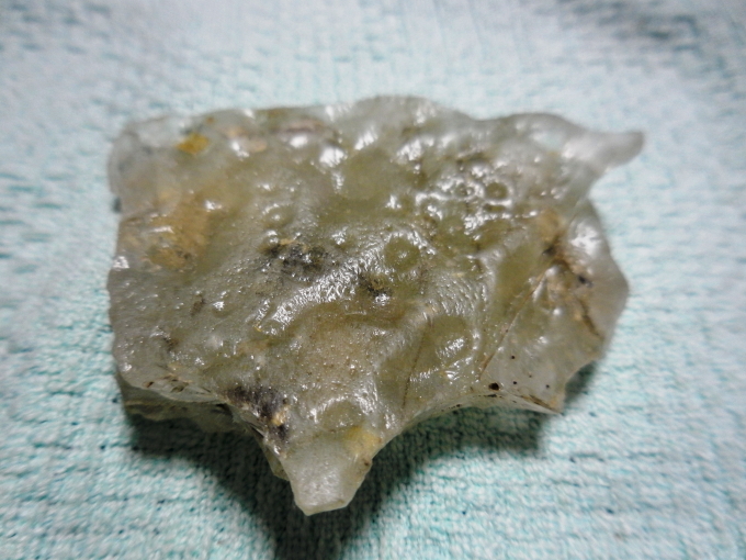 詳しく見ると、表面のディンプル模様や内部に細かい気泡・不純物が見えます。天然ガラスではないかと考え、ネットで調べた結果、日本での報告はありませんが、隕石が衝突した際に作られる、テクタイトという鉱物に似ていることがわかりました。