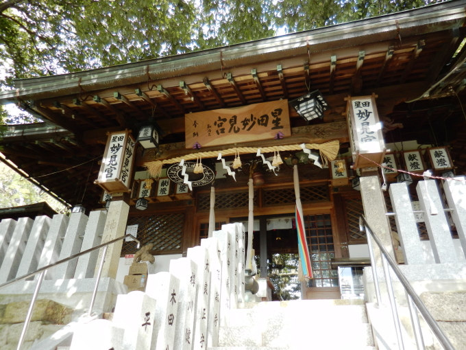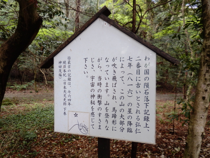 さらにネットで調べると、交野市にある星田妙見宮の「星の降臨」伝説が見つかりました。境内にある説明書きによると、「我が国の隕石落下記録上、二番目に古いとされる弘仁7年(816)星の降臨によって・・・」とあります。また、別の説明書きには、「弘法大師が獅子窟寺で修法された折、当霊山に七曜の星が降臨し・・・」という話も書かれています。