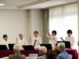 (演奏曲目)【 1:Trumpet Voluntary 2:Andante Maestoso (Jupiter) 3:Silver Bell 4:みかんの花咲く丘 5:竹田の子守歌 6:見上げてごらん夜の星を】を熱演され、特に4番、6番は参加者全員で声を張り上げての合唱でした。演奏が終わった後も拍手が鳴りやまず、アンコールの声に応えられ、「ふるさと」を演奏して頂き、これもみんなで歌いました。素敵な一時でありました。