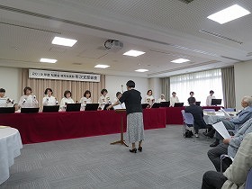 今年度の第一部は、16班岩爪支部役員の司会・進行で開会しました。 まず、 昨年度物故された29柱の会員に対し、全員で黙祷を捧げた後、庄子支部長が開会に当たってご挨拶があり、創業100周年に関するお話や、新しい「令和」の時代のスタートに当たり、新たな気持ちで、皆様と共に松愛会枚方北支部を盛り上げていきたいとの決意が述べられました。続いて、松愛会本部の上田 勉会長のメッセージが代読され、支部総会議事に入りました。