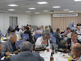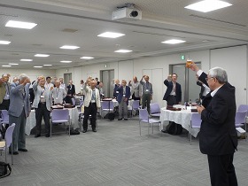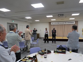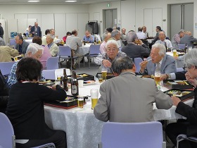 第3部は、司会を4班の石川支部役員が担当し、会場は懇親会に変わりました。 まず庄子支部長の発声で「乾杯」後、懇親会のスタートです。  会場の後ろの大型テレビには、先般の100周年感謝会の模様が映し出され、宴を盛り上げてくれました。また、会場では「愛の募金」の箱が回され、今年も暖かい多くの募金が集まりました(募金額は9,361円でした。ご協力いただいた皆さんありがとうございました)。  食事に舌鼓を打ちお酒も入り、時間も忘れ参加者同士多いに盛り上がったところで、閉会の時間となり、恒例の枚方北支部の替歌「いつでも夢を」は、参加者の中から歌声リーダーの飛び入りもあり、全員盛り上がった合唱でした。  最後に掛江新副支部長の一本締めで、2019年度の支部総会を閉会しました。