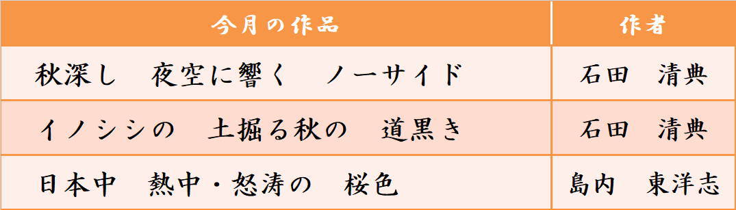 毎月25日までに寄せられた作品を、翌月に各部お一人2作品まで発表します。 なお、川柳作品は会報「松愛」に掲載することもあります。