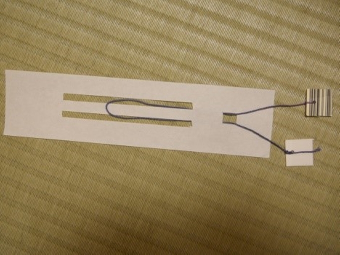 集合の待ち時間に、筒井さんから「糸を抜いて下さい」と「知恵の輪」のクイズ提供(写真)があり、皆 頭の体操をして時間待ちしました。