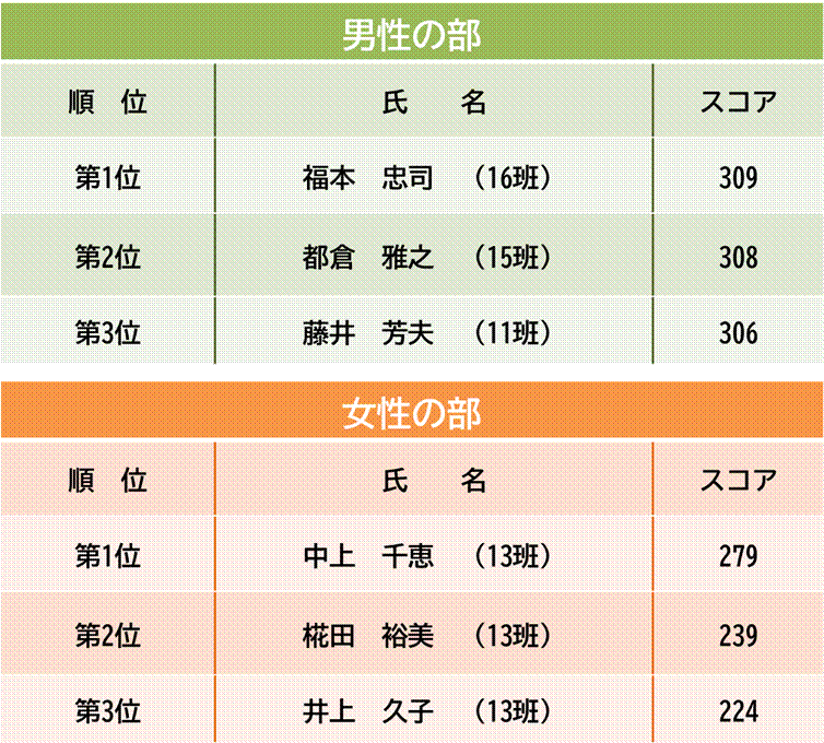 した。上位成績は以下の表のとおりですが、上位3名が3ピン差の大接戦で大いに盛り上がりました。