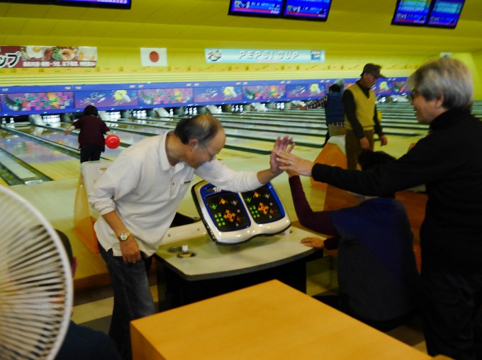 ゲーム開始に先立ち、集合写真の撮影・準備運動などを行い、14:00から予定通り約5分間の練習ボウルの後、ボウリング大会のゲームをスタートしました。今回は初めて会員のお孫さん(10歳・2名)の参加もあり、レーンはガーター防止柵を設置しました。おじいちゃんのストライクには皆でハイタッチ!! まさにファミリーボウリング大会でした♪
