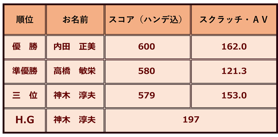 2位には、久々の好投球で1ピン差で逃げ切った高橋敏栄さんが入賞、3位には、ハイゲームを出しながら後半息切れで1ピン逆転された神木淳夫さんが、4位に2ピン差ながらが押しきって入賞しました。