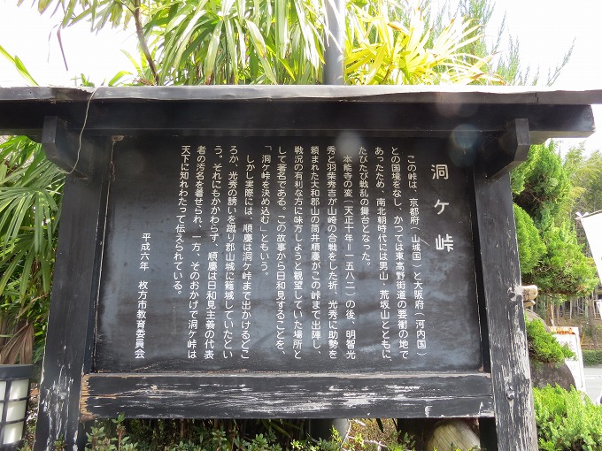 国道一号線を京都方面に進むと、京都府八幡市と枚方市との境で、東高野街道の山城と河内の国境といわれる場所に、標高70m程度の【洞ヶ峠】という場所があります。
