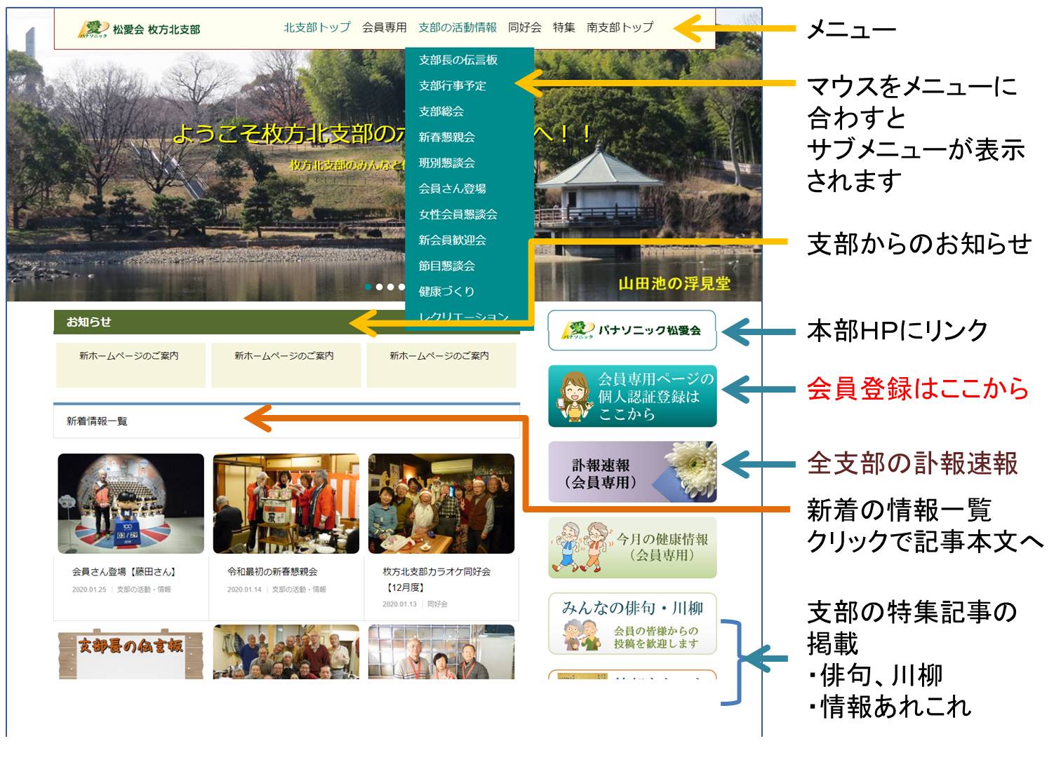 2020年1月16日より、枚方北支部のホームページを、新サイトに移行しました。これは松愛会本部を含む全支部が共通の「WordPress」サイトで作成したものです。3月末には本部も同じサイトに移行したため、支部の記事をリアルタイムで本部のHPにも掲載が可能となりました(ただし、掲載する記事は支部の判断による)。また他支部の掲載記事を見ることもでき、ID/PWを登録している会員は、全支部の会員専用ページも閲覧することが可能です。