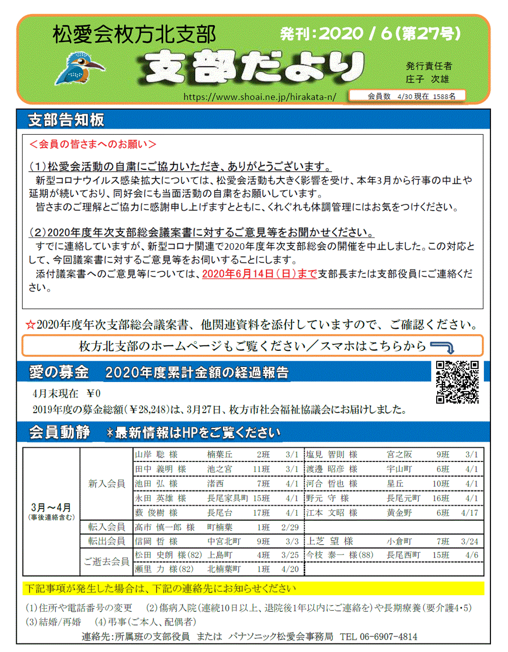 2020.05.31 未分類 支部だより27号 2019年12月以前の「支部だより」は 旧ホームページにリンク しております 枚方北支部・年次支部総会の議案書は掲載しておりません。 以上 投稿者: 坂本 未分類 コメント: 0
