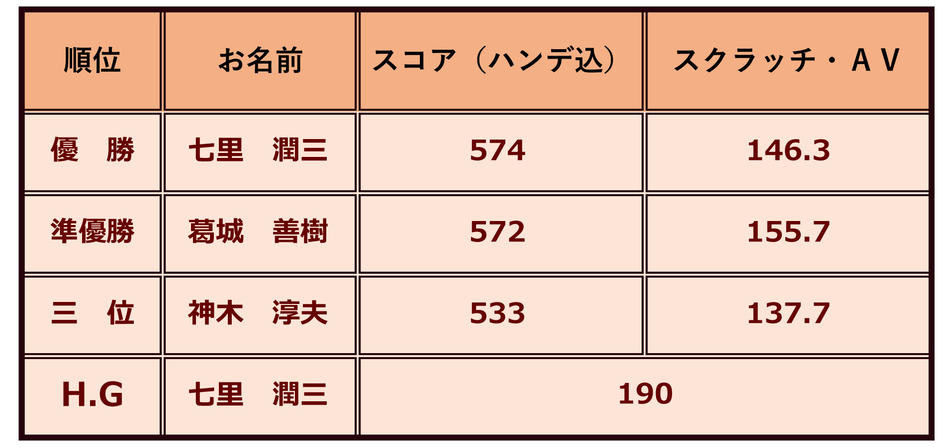 今回の優勝は、これまで度々上位に食い込みながらどうしても勝てなかった七里潤三さんが、2ピン差で逃げ切り優勝をしました。2位には、惜しくもハイスコアを出すも、あと少しの踏ん張りが足らなかった葛城善樹さんが入りました。3位には、4位と同スコアでしたがHCの差で神木淳夫さんが滑り込みました。