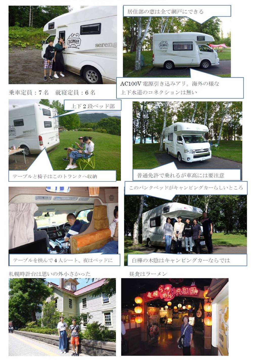 借りたのは、Serengeti [セレンゲティ] 冷蔵庫・簡易キチン・簡易トイレ付きの7 人乗り、寝ることが出来るのは6 人、シャワーはありません。電子レンジもありません。詳しくは車両紹介ページに写真付きの解説があります:https://do-camper.com/car/レンタル料金は1 日34,000 円で、プラス保険にはしっかり入りました。